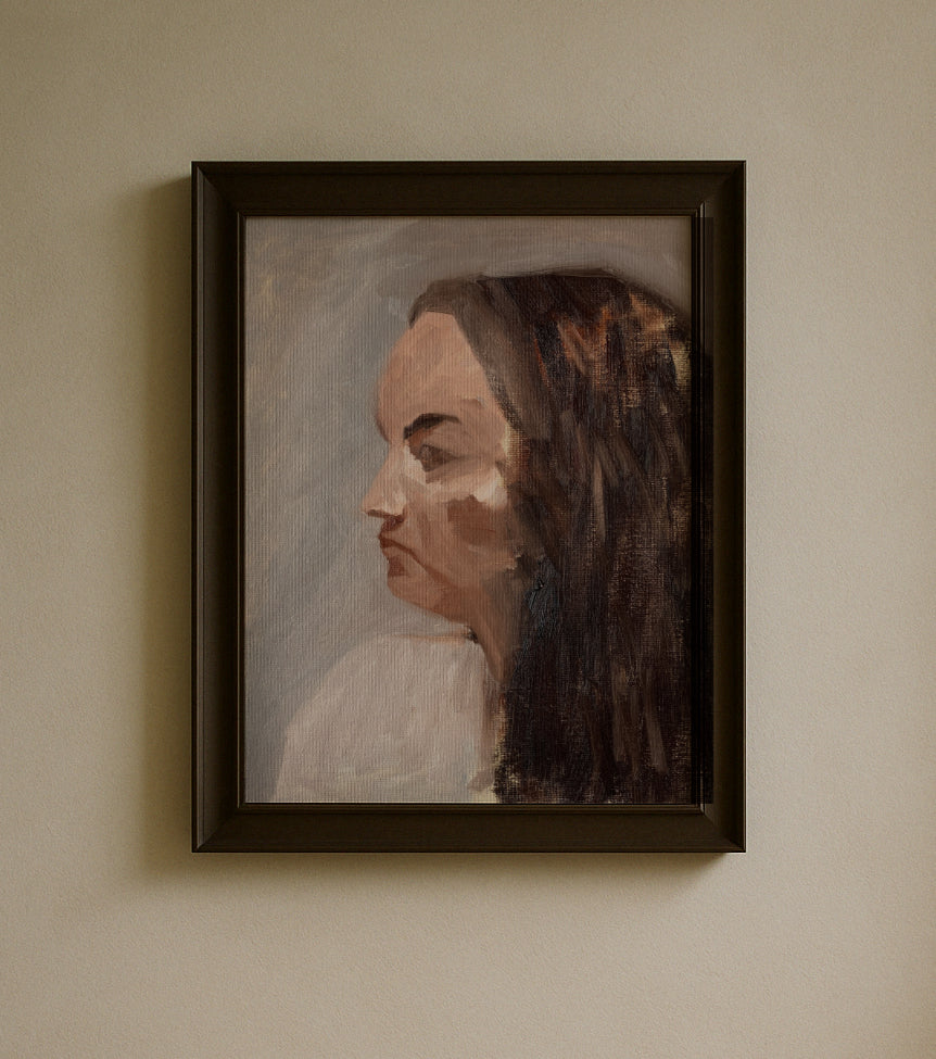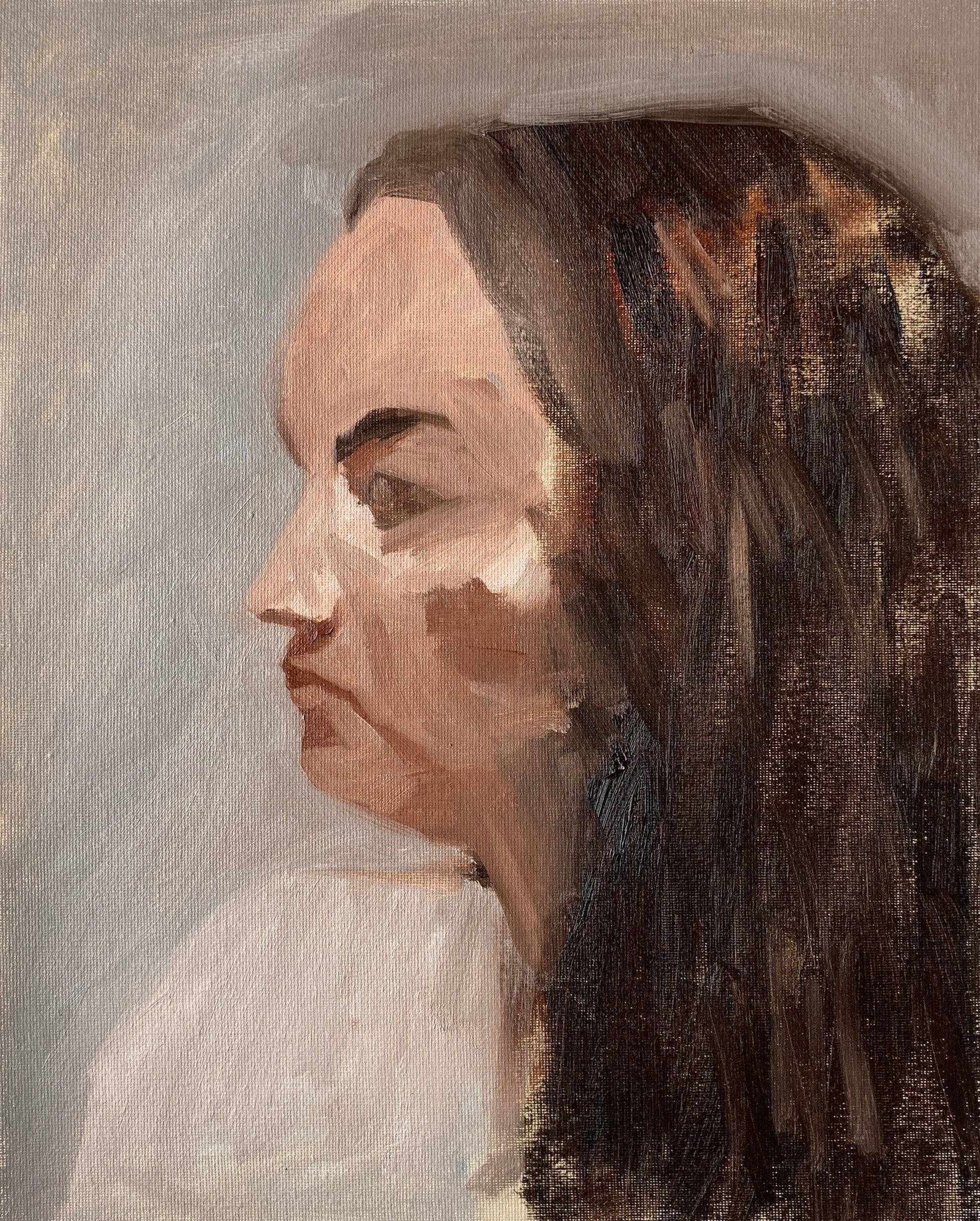 This portrait from life uses the Zorn palette of limited colours reminiscent of 19th century Impressionist painting. The approach is employed here to put focus on the tonal values of the subject and evoke a sense of time and place, but also to bring attention to the constituent elements of the image. The work also uses traditional atelier figurative painting methods to shift emphasis from stylistic expression and to foreground instead the interaction between the artist and the model.